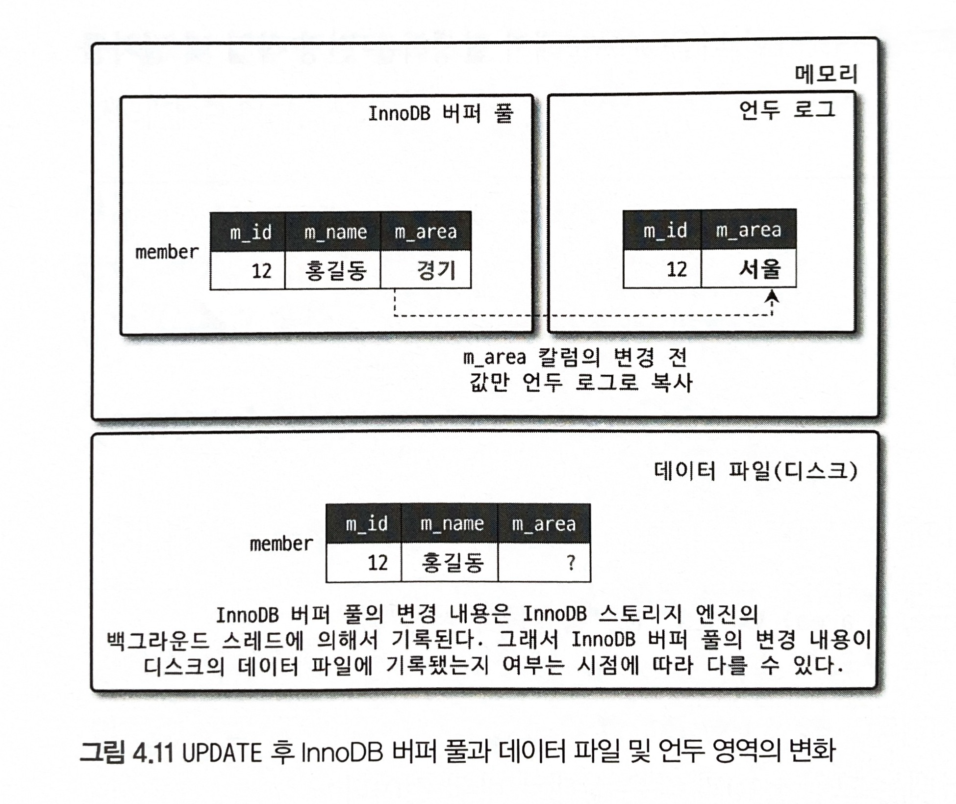 - READ_UNCOMMITTED 이상의 격리 수준: 아직 커밋되지 않았기 때문에 InnoDB 버퍼 풀이나 데이터 파일에 있는 내용 대신 변경 전의 데이터를 보관하고 있는 언두 영역의 데이터를 반환한다.