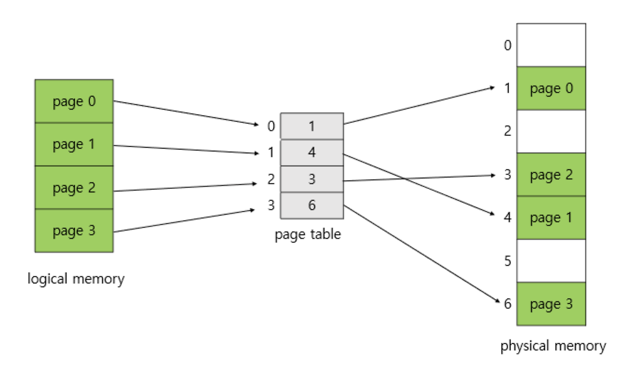 - 프로세스의 논리적 주소 공간과 물리적 메모리 공간이 모두 같은 크기의 페이지/프레임 단위로 나누어지기 때문에 외부 조각이 발생하지 않는다.