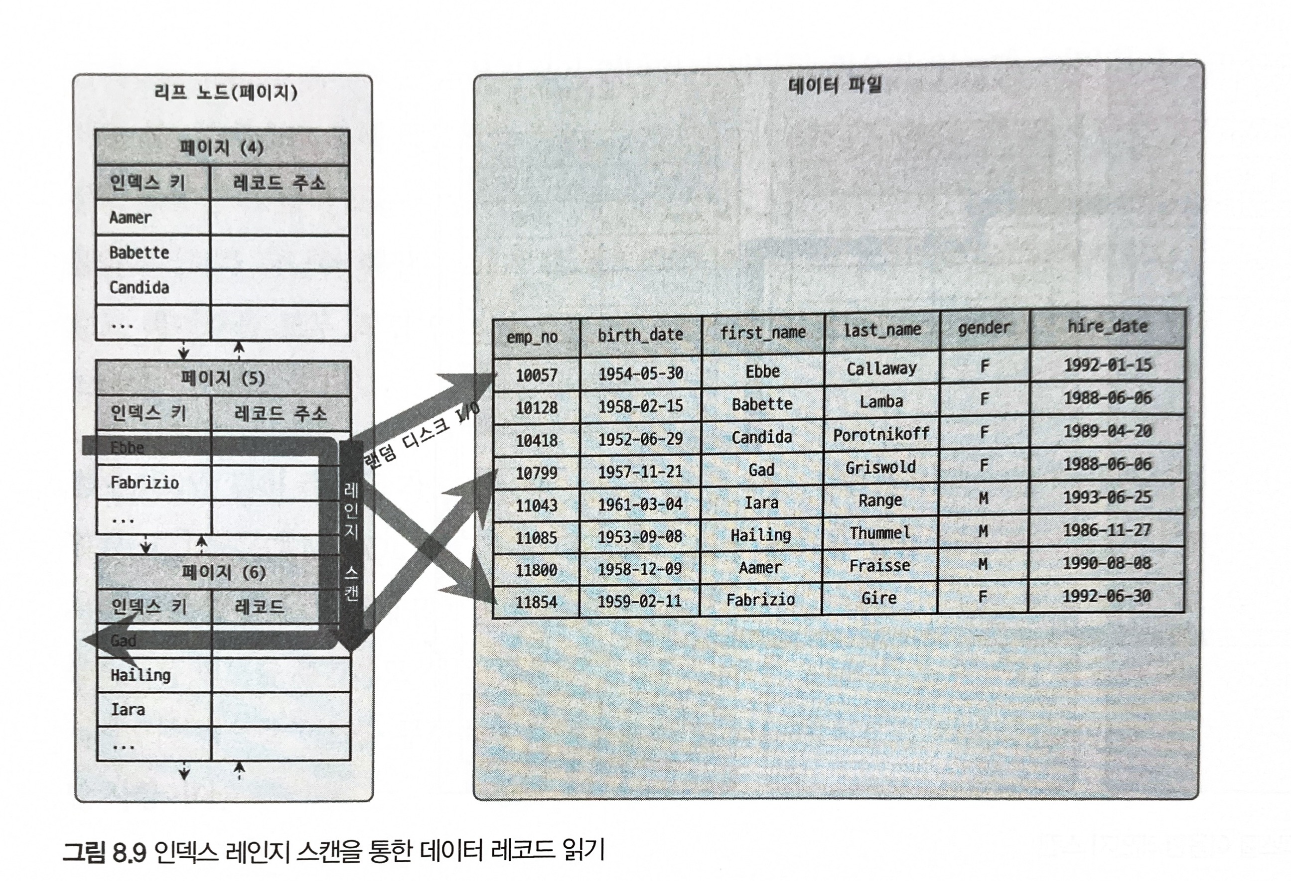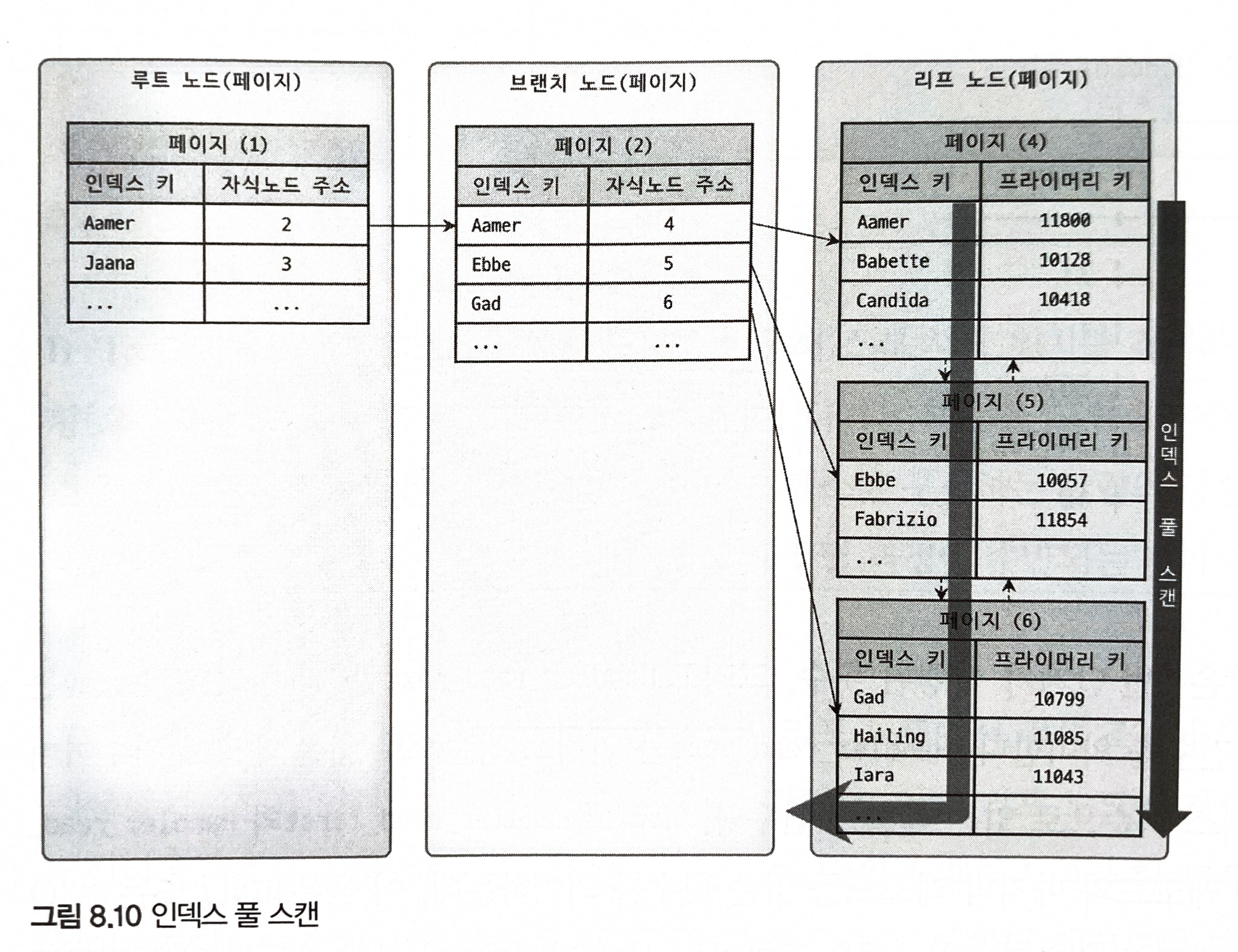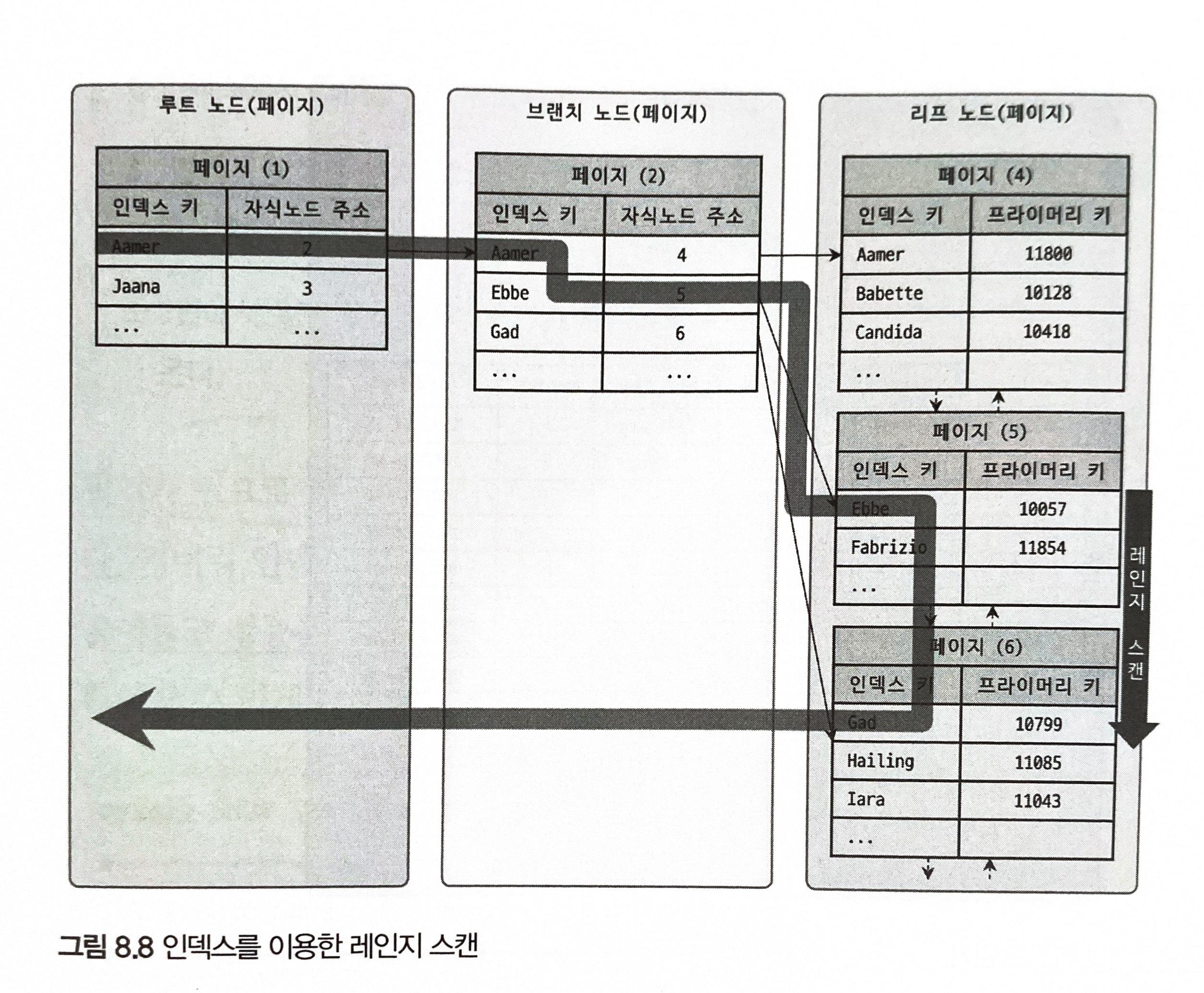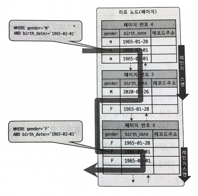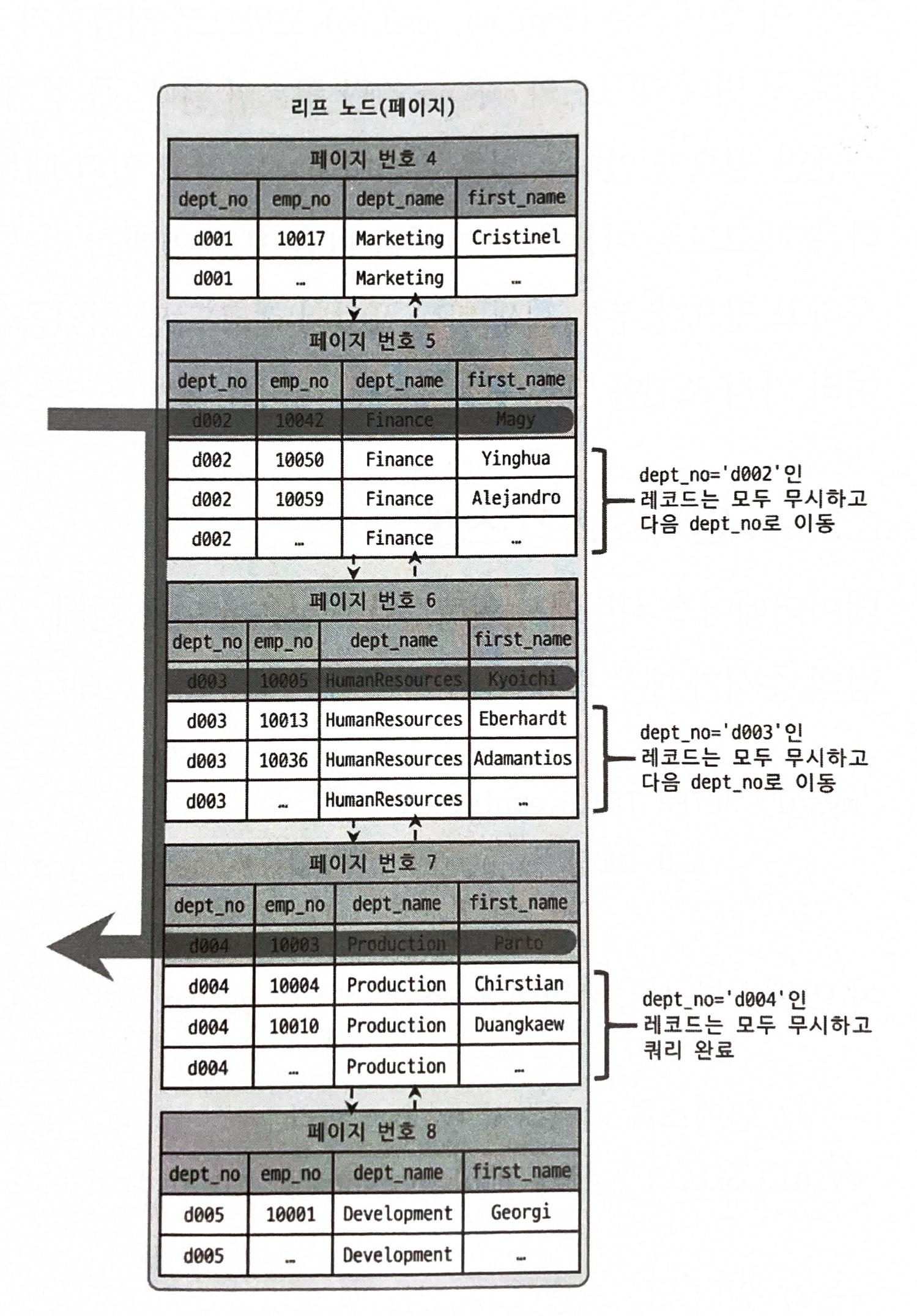 - 검색할 레코드의 시작점을 찾았으면 그때부터 리프 노드의 레코드만 순서대로 읽는다(스캔).