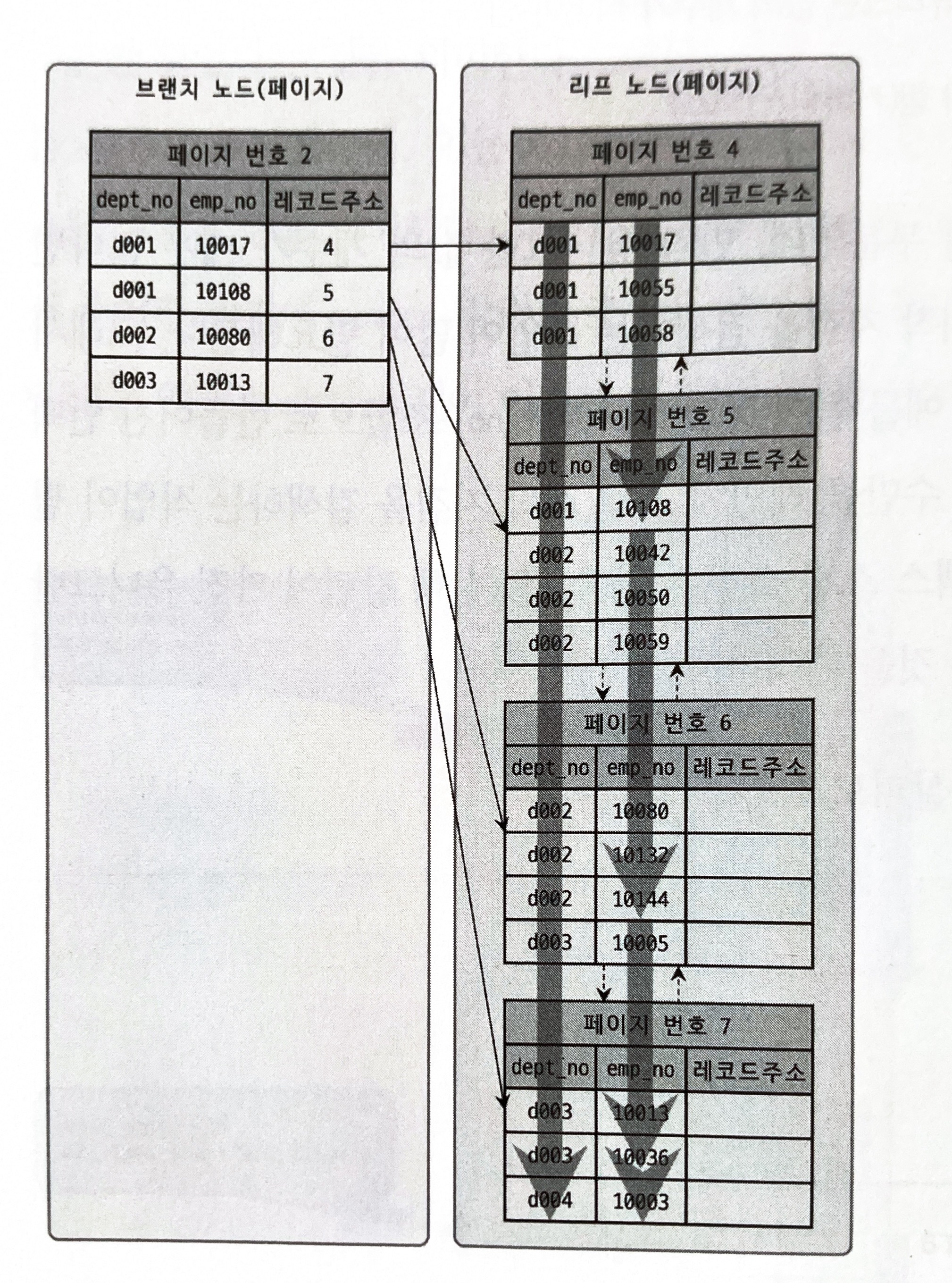 - 2번에서 읽어 들인 인덱스 키와 레코드 주소를 통해 실제 레코드가 저장된 페이지를 가져와서 최종 레코드를 읽는다.