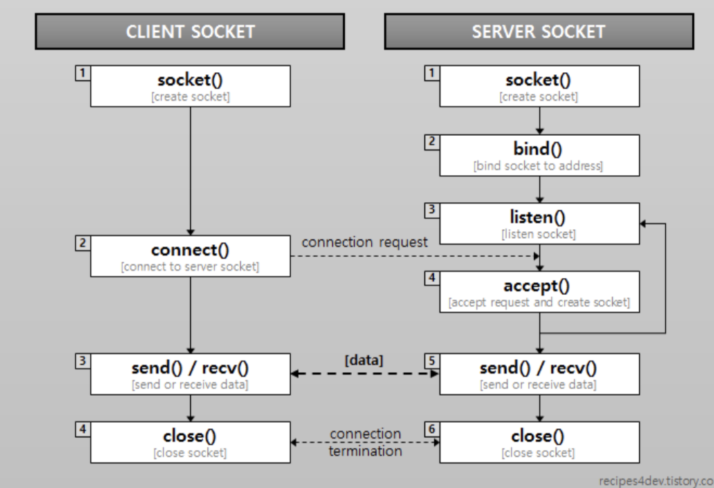 - close(): 데이터 송수신이 완료되면 소켓을 닫는다. 데이터 송수신이 끝난 후에는 소켓을 닫기 위해 close() api를 호출한다. 닫힌 소켓은 더이상 유효하지 않기 때문에 해당 소켓을 통해 데이터 송수신이 불가하다. 만약 소켓 연결이 종료된 후 데이터 송수신을 하려면 다시 소켓을 생성하고 연결하는 과정을 거쳐야 한다.