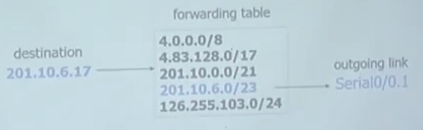예를 들어 도착지 IP 주소가 201.10.6.17일 때 다음 포워딩 테이블에서는 201.10.0.0/21에도 해당되고 201.10.6.0/23에도 해당된다. 여러 개가 해당되는 경우에는 더 많은 비트 수가 일치하는 것을 채택한다. 즉, 23개의 비트가 일치하는 201.10.6.0/23에 맞춰서 아웃풋된다.