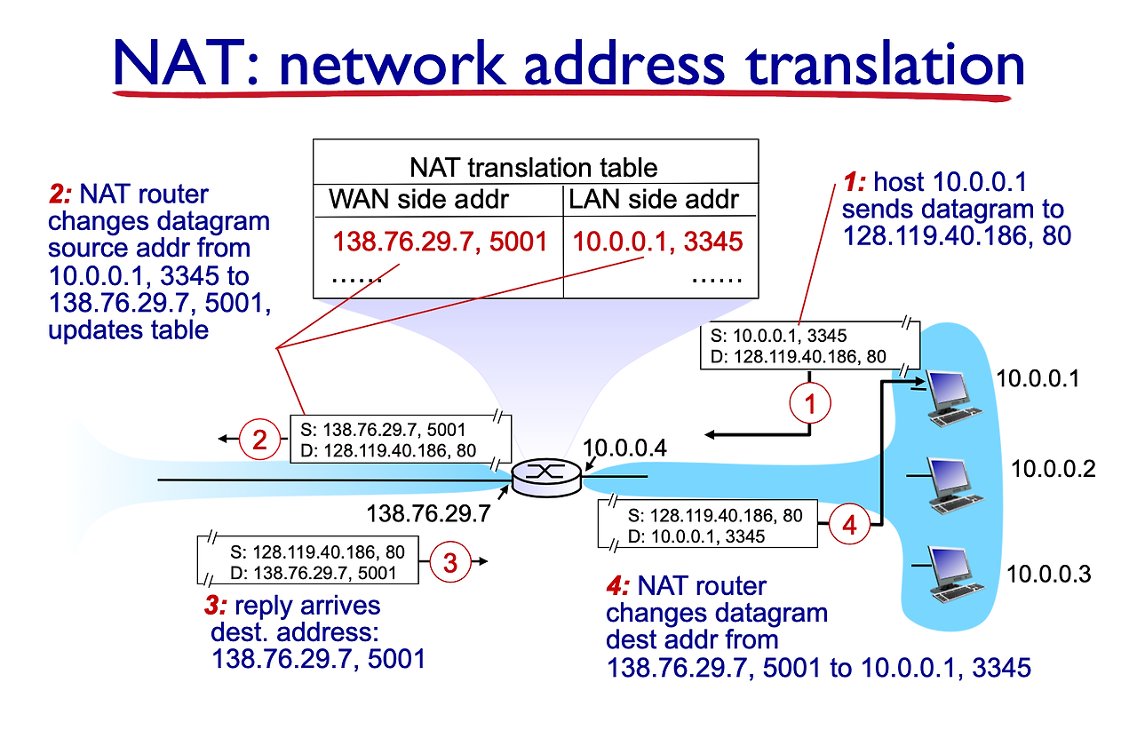 - NAT 라우터는 테이블을 참고하여 IP 주소가 138.76.29.7이고 포트 번호가 5001인 정보를 찾아 변환시켜 포워딩한다. (138.76.29.7, 5001 ➡️ 10.0.0.1, 3345)
