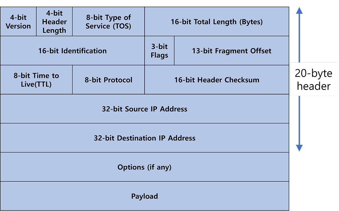 - 예를 들어 프로토콜 필드 값이 4이면 패킷의 데이터 영역에는 UDP 세그먼트가 들어 있다.