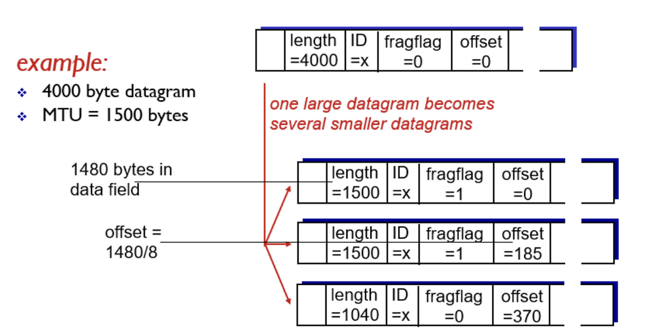 따라서 패킷이 MTU보다 큰 경우, 패킷이 쪼개지는데, 패킷 도착 후 쪼개진 패킷들을 재조립하기 위한 정보들이 패킷 헤더의 Identification, Flags, Offset 필드에 담긴다.