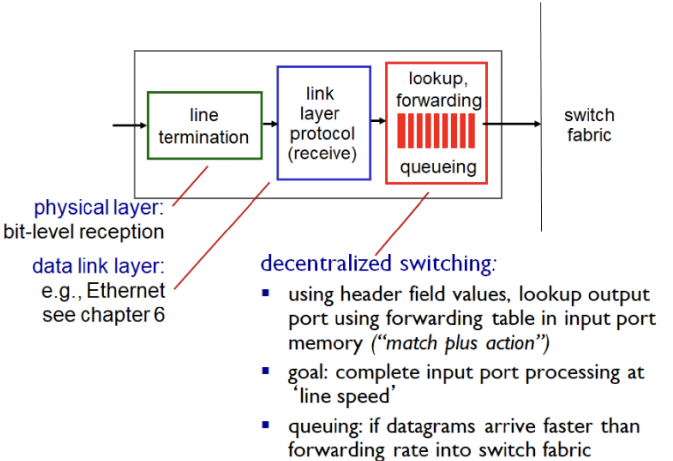 하나의 라우터에는 여러 개의 인풋 포트가 있는데, 빠른 처리를 위해 각 인풋 포트마다 라우팅 테이블을 독립적으로 라우팅 테이블을 갖는다. 그리고 아무리 빠르게 처리한다고 하더라도 처리 속도보다 패킷이 들어오는 속도가 빠를 수 있기 때문에 각 인풋 포트마가 처리를 위한 큐를 갖는다.