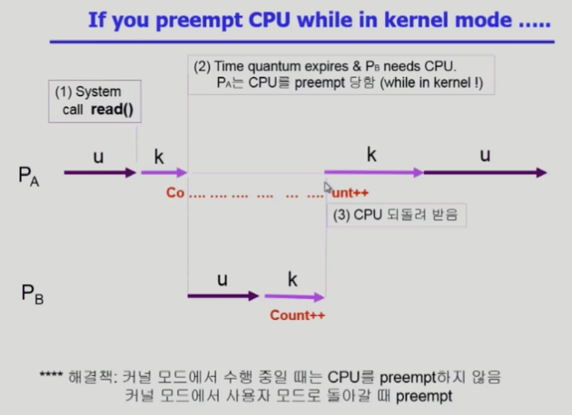 즉, 운영체제 커널과 같은 공유 자원은 여러 프로세스가 접근할 수 있기 때문에 경쟁 상태가 발생할 수 있다. 그리고 문맥 교환 시 기존에 실행하던 프로세스의 레지스터 값을 PCB에 저장하여, 나중에 해당 프로세스가 다시 CPU를 사용할 때 마저 연산을 수행하기 때문에 CPU가 하나여도 경쟁 상태가 발생할 수 있다.