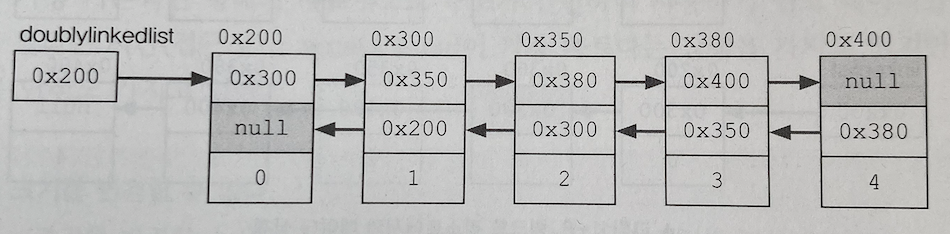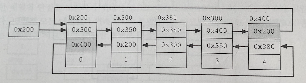 - Doubly Circular LinkedList: Doubly LinkedList의 첫 번째 요소와 마지막 요소를 서로 연결시킨 것이다. 즉 마지막 요소의 다음 요소가 첫 번째 요소가 되고, 첫 번째 요소의 이전 요소가 마지막 요소가 된다.