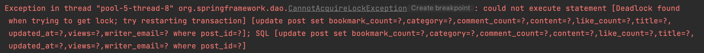 - 그리고 각 트랜잭션은 post의 likeCount 값을 변경하는 update를 실행하기 위해 post 레코드에 대한 X락을 대기한다. (데드락 발생 지점!)
