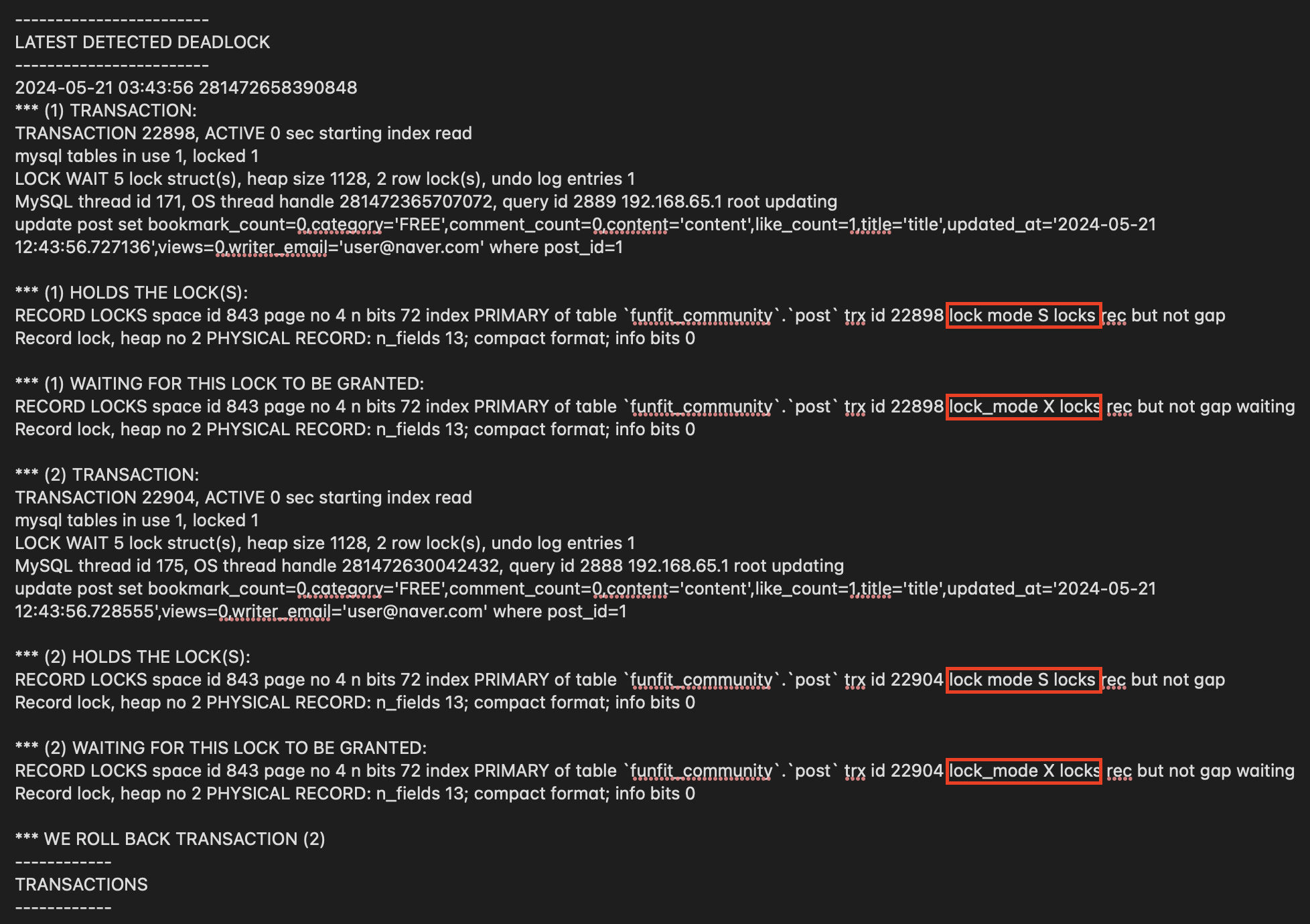 대충 트랜잭션 1과 트랜잭션 2가 각각 post에 대해 S락을 획득했고, 두 트랜잭션이 X락을 획득하기 위해 대기하는 상태가 되며 데드락이 발생한 거 같다.
