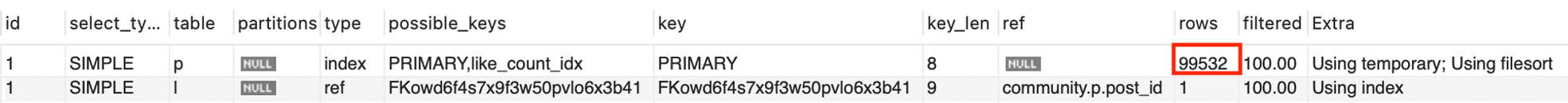 - 즉, 좋아요 순 정렬 페이징 조회 시 post와 likes 테이블의 조인 결과를 풀스캔한다.