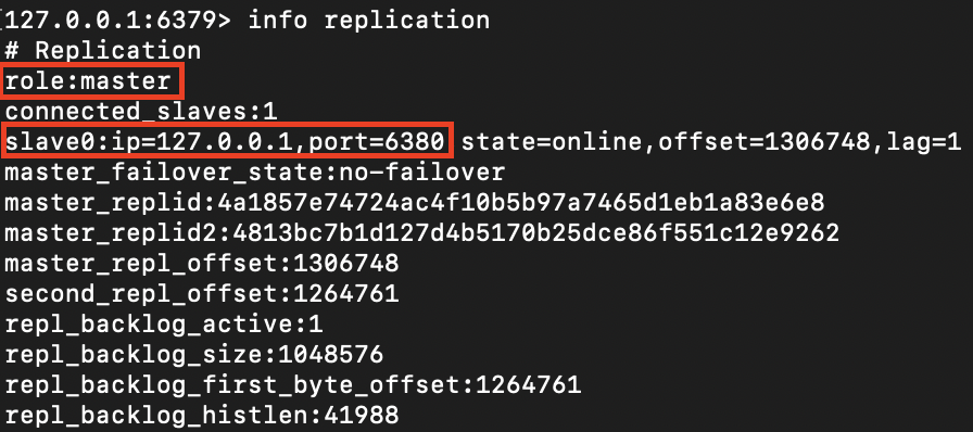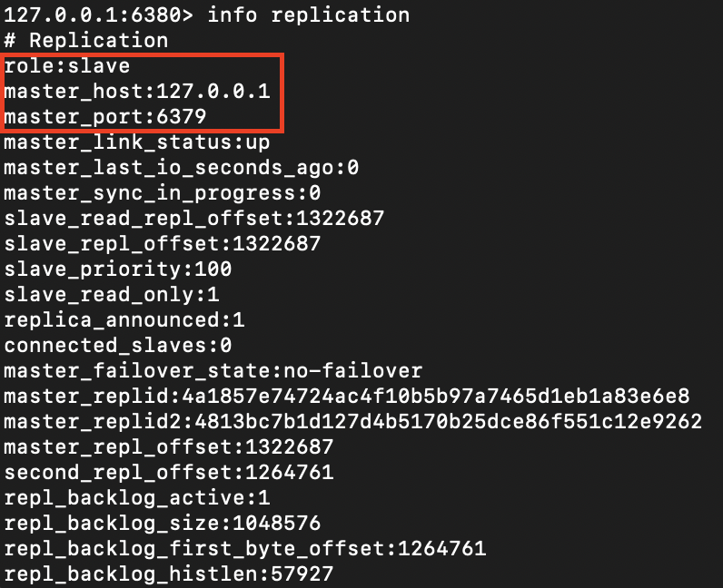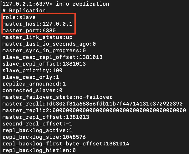 - 6380: 기존 슬레이브가 새로 마스터로 승격되었다. 그리고 자신의 슬레이브는 없다.
