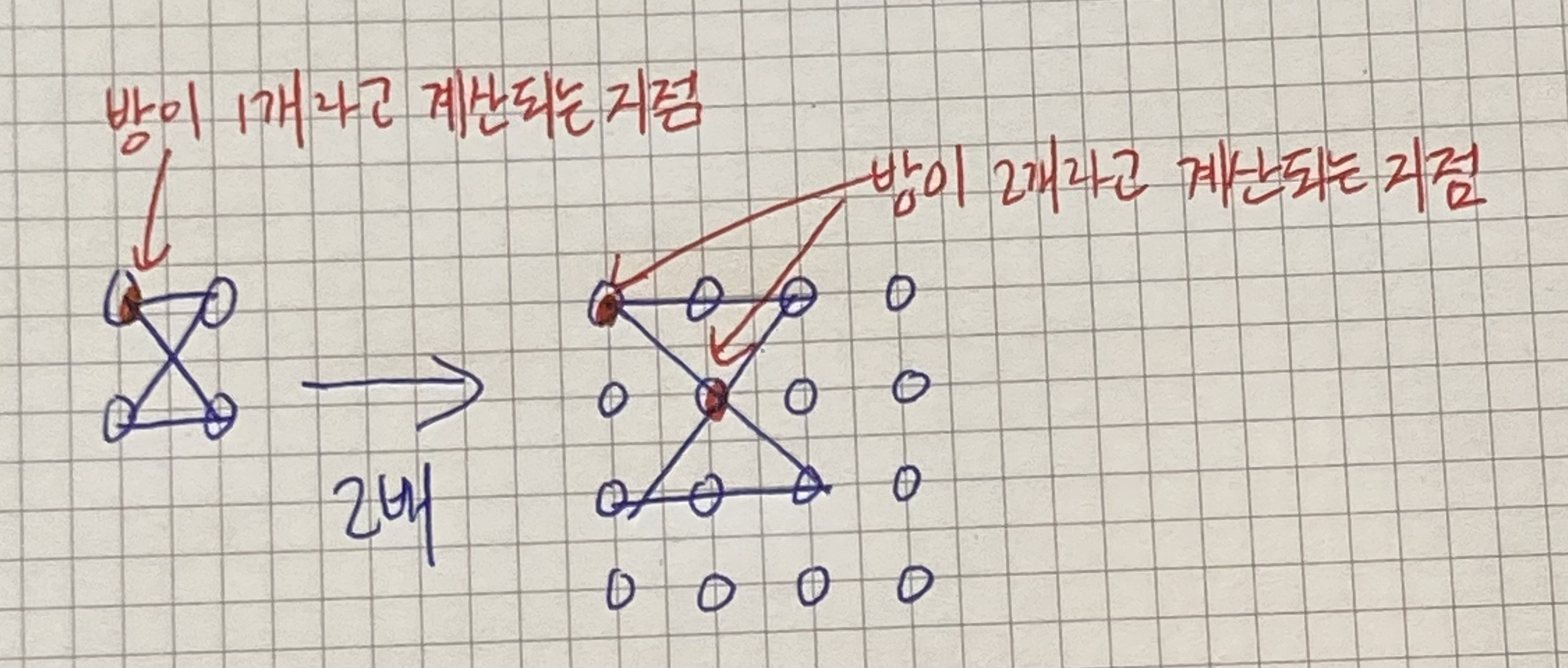 - 다음과 같이 교차점이 있을 경우 위 로직대로 생각하면, 방이 1개인 것으로 계산된다. 즉, 교차점까지 고려하기 위해선 다른 방법이 필요하다. 따라서 한 번의 이동을 2번의 이동으로 변경하면, 교차점이 있더라도 정상적으로 방이 2개인 것으로 계산된다.