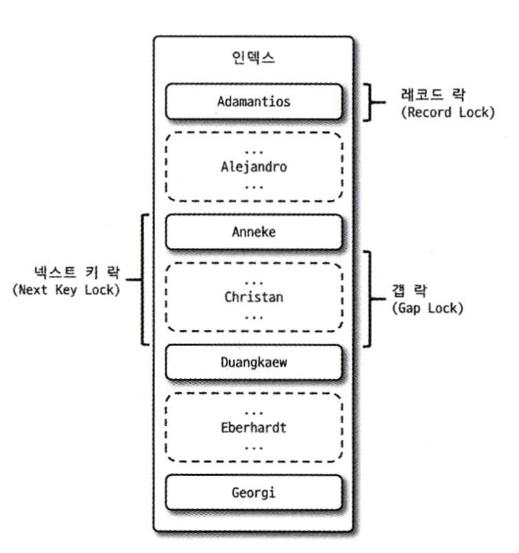 레코드 자체를 잠그느냐, 아니면 인덱스를 잠그느냐는 상당히 큰 차이를 만들어 내기 때문에 주의해야 한다.