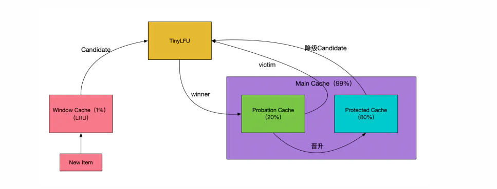 - Window 영역이 가득 차면, LRU 알고리즘에 따라 가장 오래된 항목이 제거되고, 이 제거된 항목에 대해 TinyLFU가 빈도를 계산하여, 자주 사용되었다고 판단되면 Main 영역의 Probation Cache으로 옮겨진다. 이곳에서는 LFU 방식으로 관리된다.