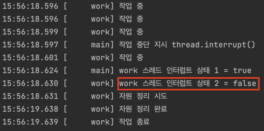 log("work 스레드 인터럽트 상태 2 = " + Thread.currentThread().isInterrupted());