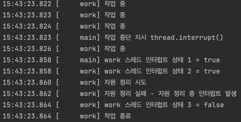 위 예제에서는 Thread.isInterrupted() 메서드를 통해 인터럽트 상태가 true에서 false로 변경된다. 따라서 자원 정리 중에 sleep() 메서드가 호출되어도 인터럽트가 발생하지 않는다. 이후에 자원이 정상적으로 정리되었다.