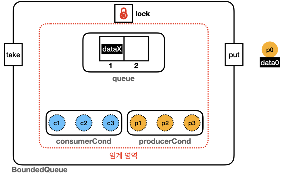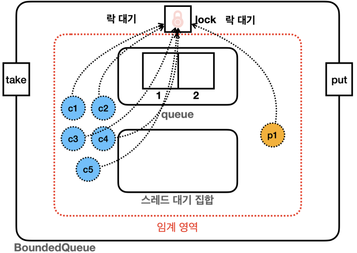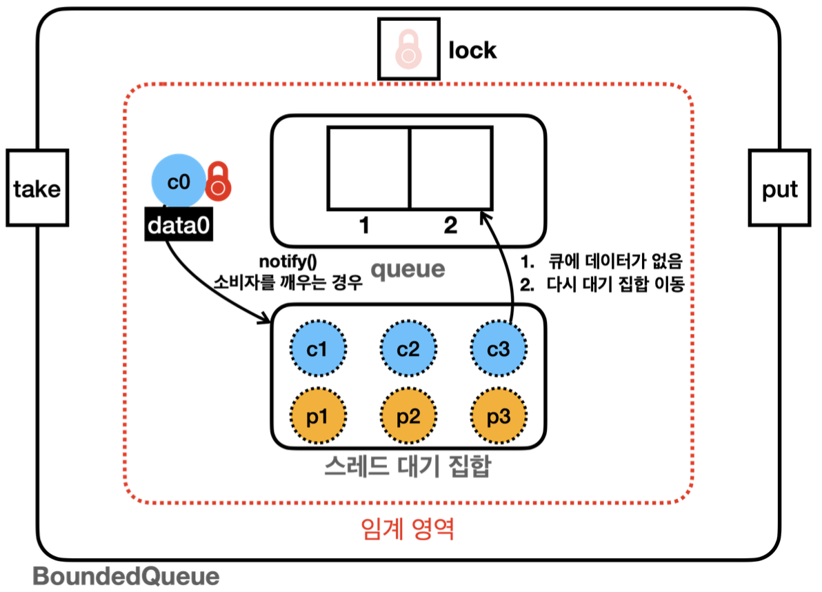 - 만약 가장 먼저 락을 획득한 스레드가 소비자 스레드라면, 큐에 데이터가 없으므로 다시 대기 집합에 들어간다.