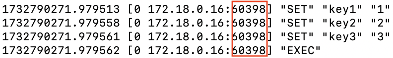 실행 결과, MULTI와 GET 명령어가 먼저 레디스 서버로 전달되었다. 그리고 10초 뒤에 트랜잭션이 종료될 때 RedisTemplate 큐에 저장된 SET 커맨드들이 한 번에 전달되었다. 그리고 읽기 커맨드와 쓰기 커맨드가 서로 다른 커넥션을 통해 레디스 서버로 전달된 것도 확인할 수 있다.