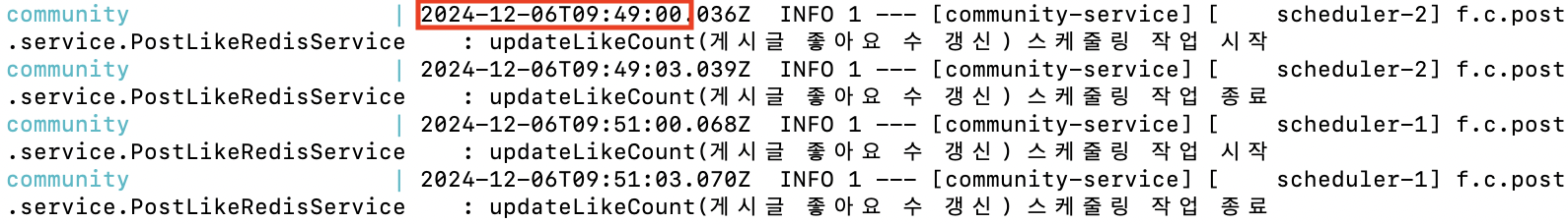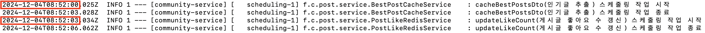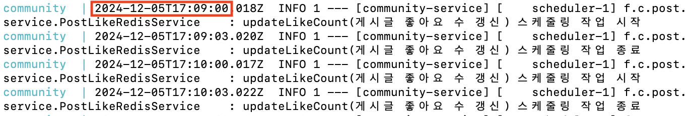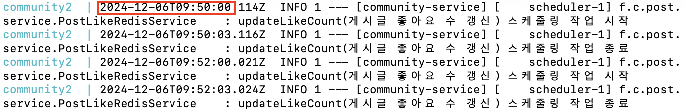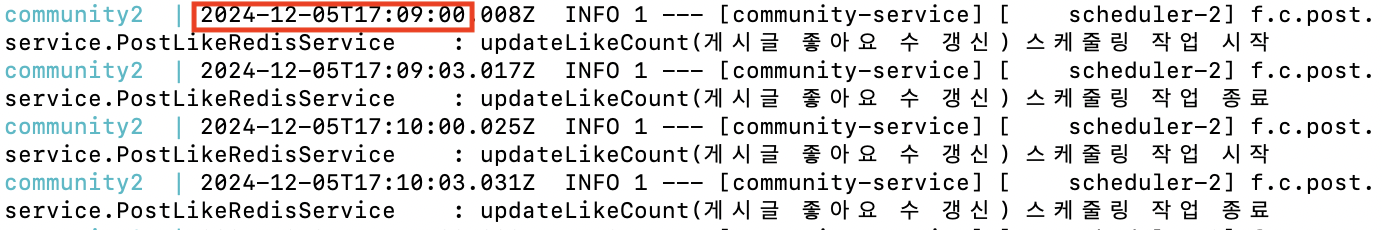 log.info("updateLikeCount(게시글 좋아요 수 갱신) 스케줄링 작업 시작");