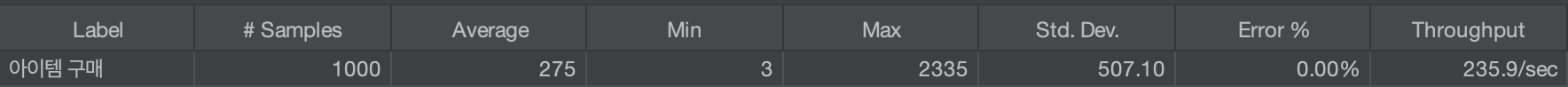 분산 락 방식과 레디스에서 재고 관리를 하는 방식의 성능을 비교해보자. 테스트를 위해 아이템의 재고를 100개 INSERT 해두었고, 1,000개의 구매 요청을 보내도록 했다.