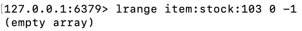 103번 아이템을 상품으로 등록했으나 롤백되었다. 이때 레디스에서 확인해보면 값이 저장되지 않은 것을 알 수 있다.