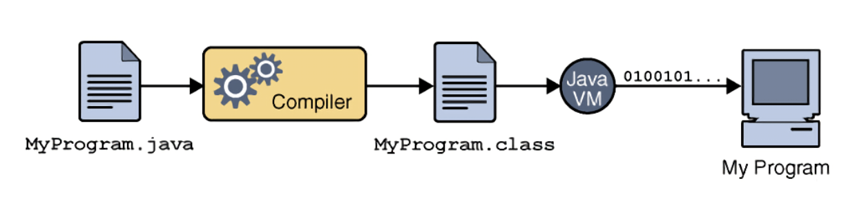 위에서 말했듯이 자바 프로그램은 JVM이라는 특성 때문에 두 번의 단계를 거쳐야 한다. 첫 번째는 .java 파일을 .class 파일로 바꾸는 컴파일 단계이고, 두 번째는 .class 파일을 이진수의 바이너리 코드로 변환하고 실행하는 단계이다.