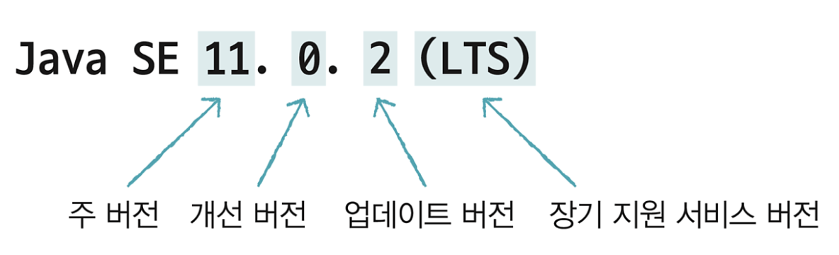 Java 11, Java 17과 같이 여러 버전이 있는데 이 버전은 JDK의 버전을 의미한다. 그래서 자바를 설치한다는 것은 JDK를 설치한다는 의미이다. 자바 버전은 다음과 같이 표기한다.