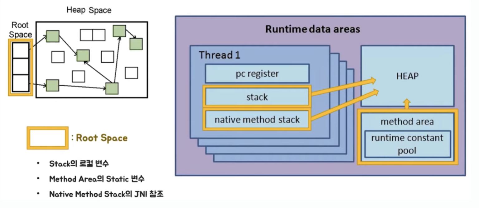 Mark And Sweep 방식은 루트로부터 해당 객체에 접근이 가능한지가 메모리 해제의 기준이 된다. JVM GC에서 Root Space는 힙 메모리 영역을 참조하는 메소드 영역, 스택 영역, 네이티브 메소드 스택이 된다. 즉 이들을 시작으로 이들이 참조하는 힙 영역의 객체들을 순회한다.