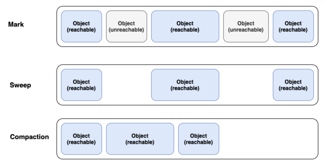 - Compact: Sweep 후에 분산된 객체들을 힙의 시작 주소로 모아 메모리가 할당된 부분과 할당되지 않은 부분을 구분한다.