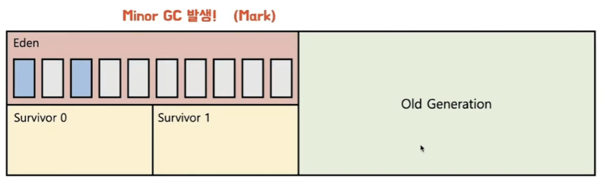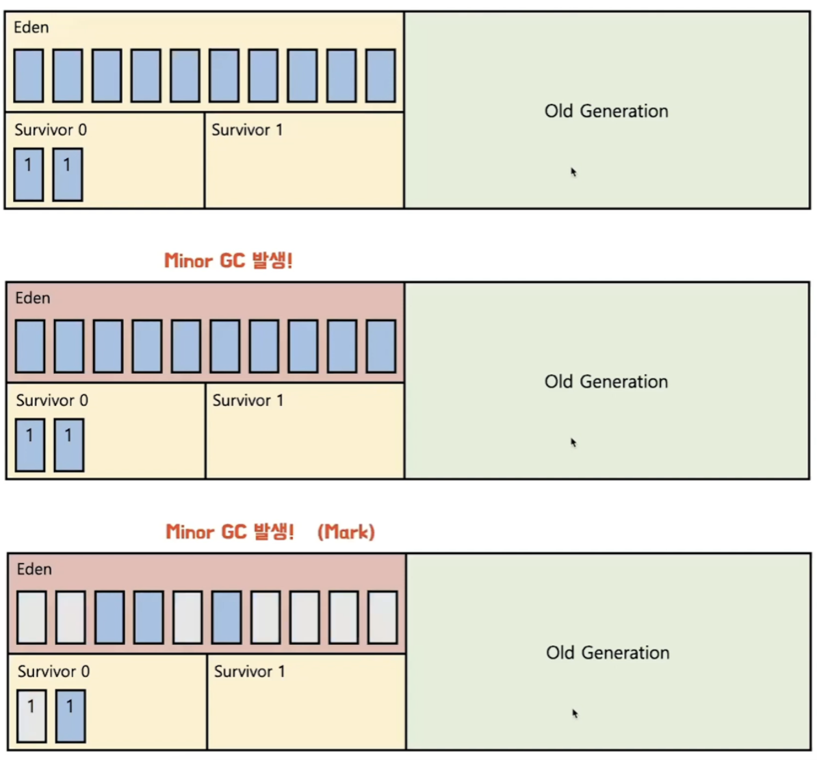 또 다시 Eden 영역에 객체들이 가득 차면 Minor GC가 발생하고 mark 한다. 이때 Survivor 영역도 Young 영역으로, Minor GC의 대상이다.