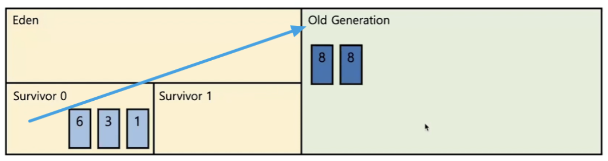 age 임계값이 8이라고 가정했을 때, 다음과 같이 특정 객체의 age 값이 임계값에 도달하게 되면, 이 객체들은 Old 영역으로 이동된다. 이를 Promotion이라고 한다.