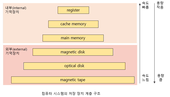 - 빠른 저장장치는 빠른 만큼 가격이 비싸기 때문에 적은 용량을 사용하며, 느린 저장장치는 가격이 저렴해 용량이 크다.