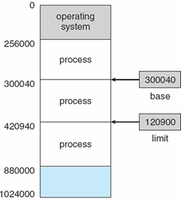 따라서 어떤 프로그램이 메모리의 특정 주소에 접근하고자 할 때, 접근하려고 하는 위치가 합법적인 범위에 있는지 체크한다. 사용자 프로그램이 접근할 수 있는 범위는 기준 레지스터에 있는 주소 ~ (기준 레지스터에 있는 주소 + 한계 레지스터에 있는 값)이다.