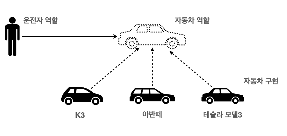다형성은 역할과 구현을 분리한다. 예를 들어 다음과 같이 자동차 역할과 그 구현이 나눠져있다고 가정하자.
