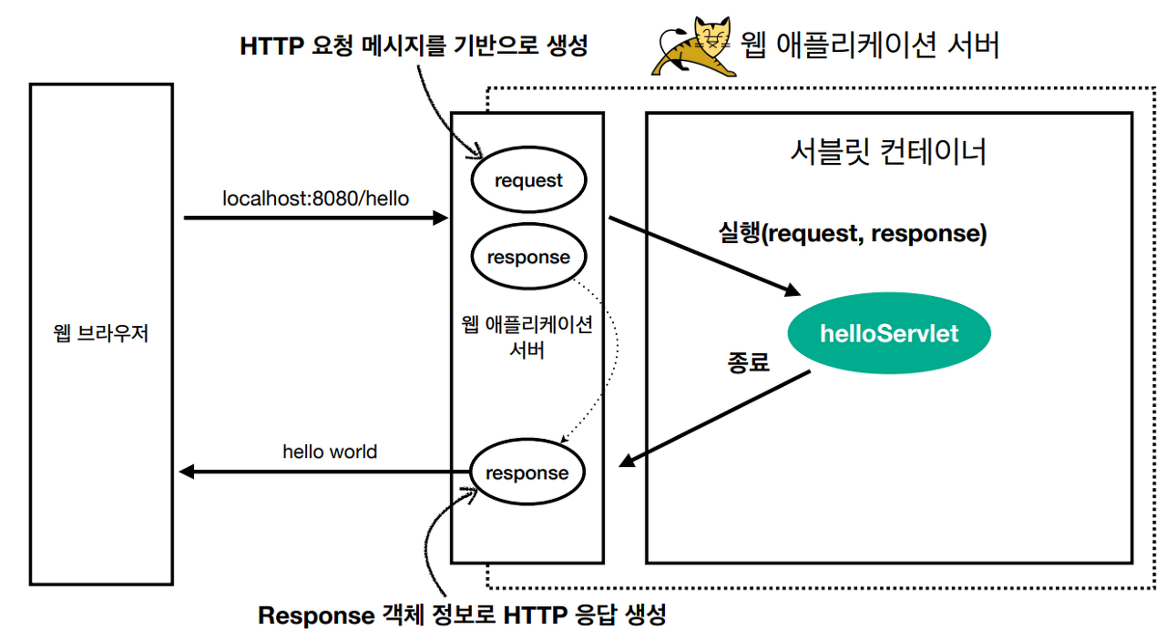 - 서블릿 컨테이너는 HTTP 요청을 받으면 request, response 객체를 생성하고, 요청에 맞는 서블릿(HelloServlet)의 service 메소드를 호출하며 생성한 request, response 객체를 넘겨준다.