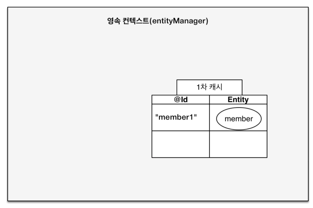 다음 코드를 실행하면 그림처럼 1차 캐시에 회원 엔티티가 저장된다. 그리고 이 엔티티는 아직 데이터베이스에 저장되지 않는다.