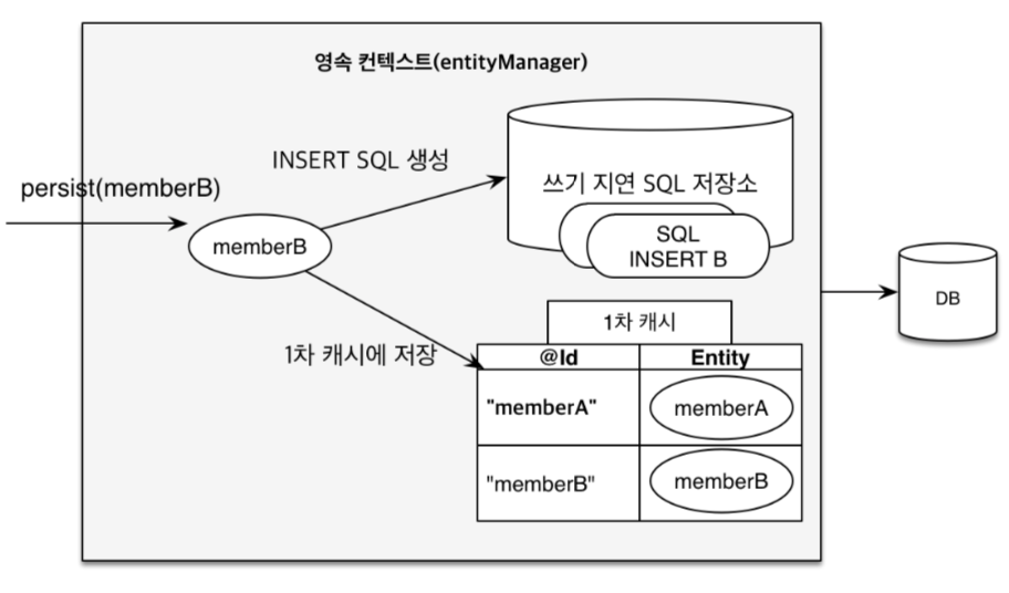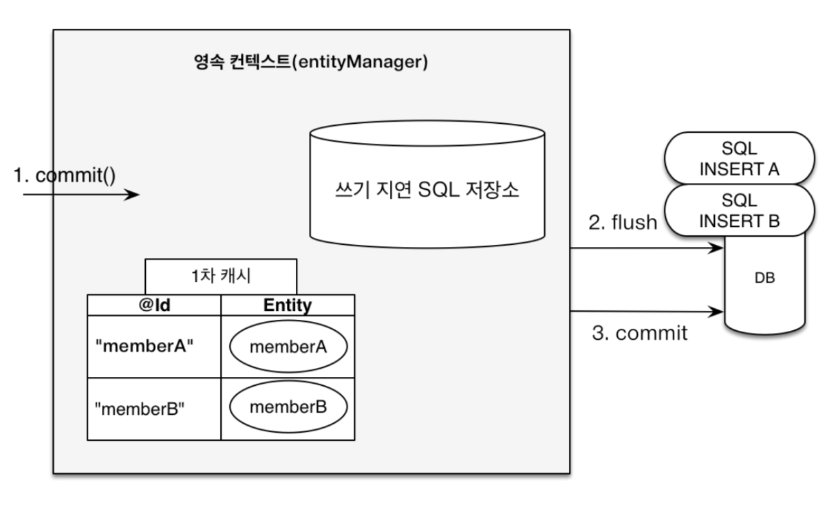 엔티티 매니저는 트랜잭션을 커밋하기 직전까지 데이터베이스에 엔티티를 저장하지 않고 내부의 쓰기 지연 SQL 저장소에 쿼리를 모아둔다. 그리고 트랜잭션을 커밋할 때 모아둔 쿼리를 데이터베이스에 보내는데 이를 트랜잭션을 지원하는 쓰기 지연이라 한다.