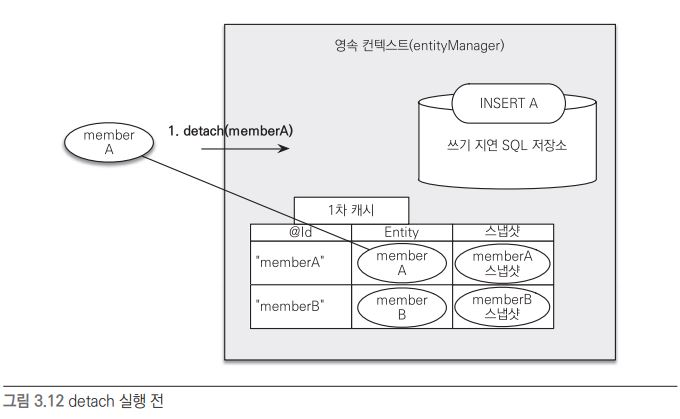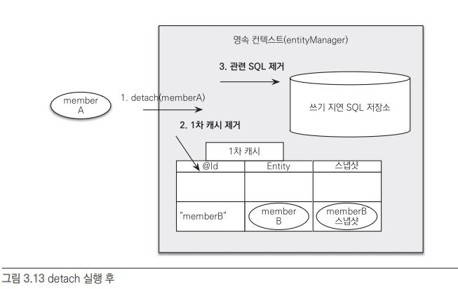 그러나 em.detach(member)를 통해 엔티티가 준영속 상태가 되면, 1차 캐시와 쓰기 지연 SQL 저장소에서 해당 엔티티에 대한 모든 정보가 제거된다.