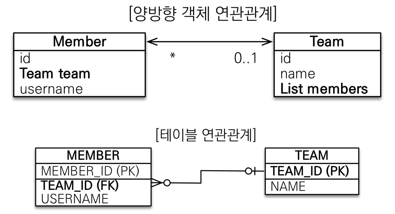 테이블의 양방향 연관관계: 반면 데이터베이스 테이블은 외래 키 하나로 양쪽에서 서로 조인할 수 있다. 즉 외래 키 하나로 두 테이블은 양방향 연관관계를 맺는다.