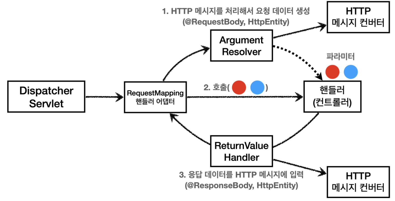 - RequestMappingHandlerAdapter 핸들러 어댑터는 ArgumentResolver를 통해 컨트롤러가 필요로 하는 파라미터 값을 생성한다. 그리고 이때 컨트롤러가 필요로 하는 파라미터가 @RequestBody 또는 HttpEntity(RequestEntity)이면 RequestMappingHandlerAdapter는 HttpMessageConverter를 사용해서 HTTP 요청 메시지 데이터를 읽어서 파라미터로 넘겨줄 객체(@RequestBody 또는 HttpEntity(RequestEntity))를 생성한다.