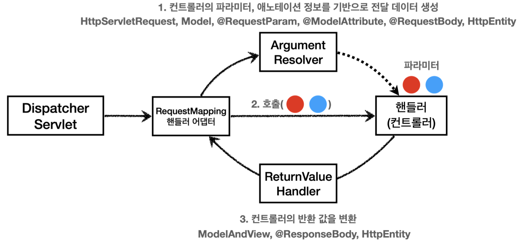 - 어노테이션 기반의 컨트롤러를 처리하는 RequestMappingHandlerAdapter는 ArgumentResolver를 통해 컨트롤러에서 필요로 하는 다양한 형식의 파라미터 값을 생성한다.