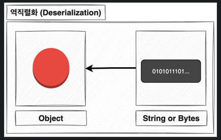 직렬화(Serialization)는 객체를 문자열 또는 바이트 스트림으로 변환하는 것을 의미한다. 반대로 역직렬화(Deserialization)는 문자열 또는 바이트 스트림을 다시 객체로 변환하는 것을 의미한다.