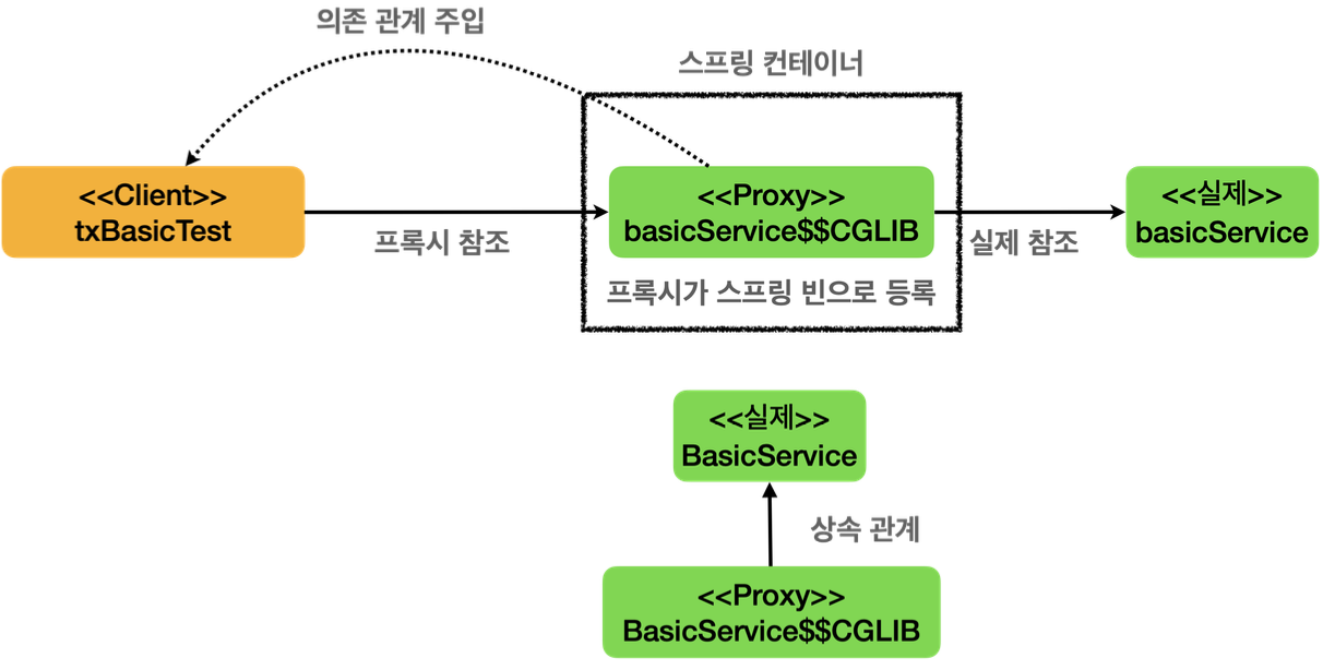 - @Transactional 어노테이션이 특정 클래스나 메소드에 하나라도 있으면 트랜잭션 AOP는 프록시를 만들어서 스프링 컨테이너에 등록한다. 즉 실제 객체(BasicService)가 아닌 프록시 객체(BasicService$$CGLIB)가 스프링 빈에 등록된다.