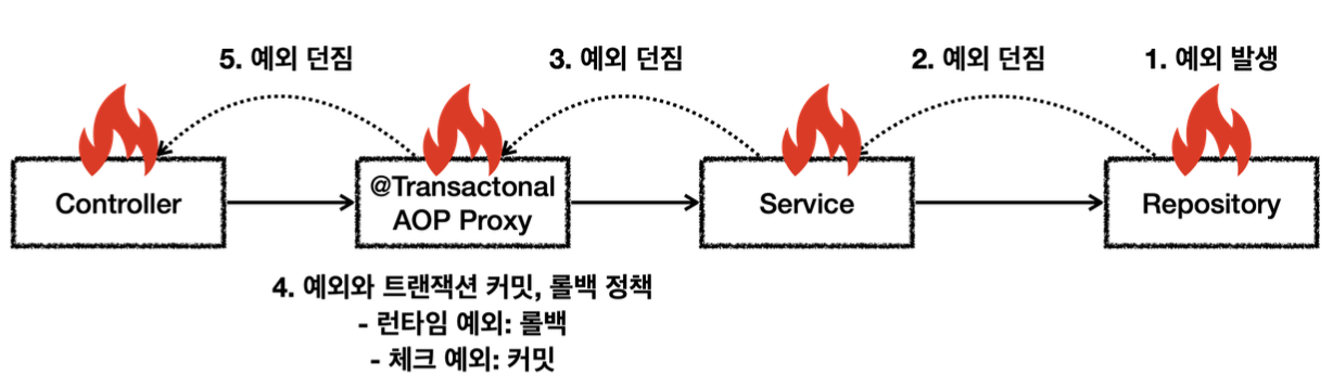만약 예외가 발생했는데 내부에서 예외를 처리하지 못하고 트랜잭션 범위(트랜잭션 AOP) 밖으로 예외가 던져지면 어떻게 될까? 스프링이 제공하는 트랜잭션 AOP는 예외의 종류에 따라 트랜잭션을 커밋 또는 롤백한다.