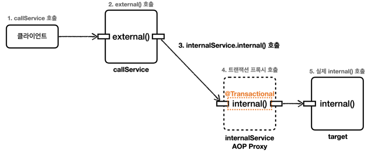 - external() 메소드는 내부에서 internal() 메소드를 호출한다. 따라서 이때 트랜잭션이 적용되어야 할 internal() 메소드가 트랜잭션이 적용되지 않은 채 호출되는 문제가 발생한다.