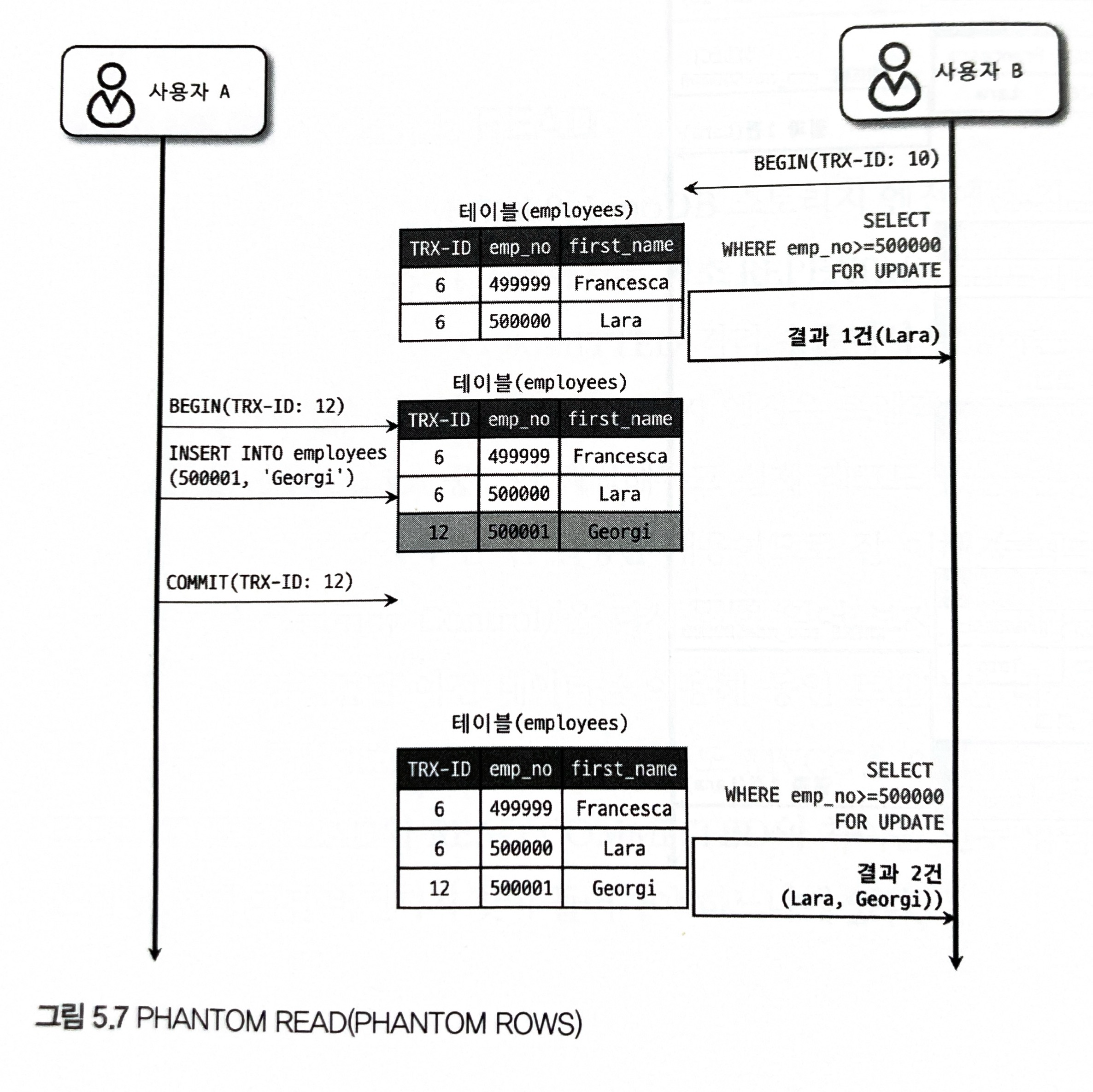 - PHANTOM READ는 하나의 트랜잭션 내에서 여러 번 실행되는 동일한 SELECT 쿼리에 대해 결과 레코드 수가 달라지는 형상이다.