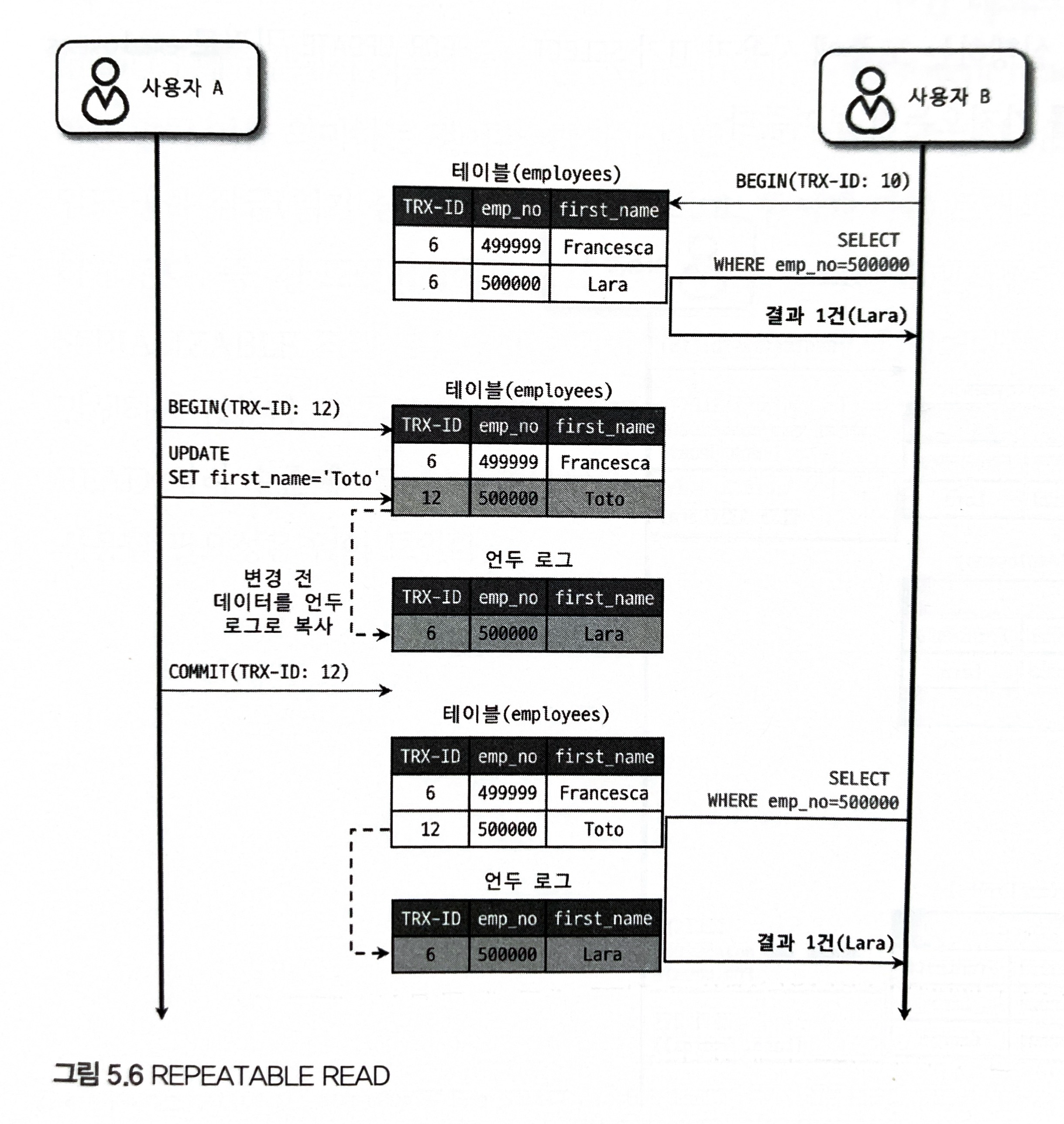 - 이전에 살펴본 커밋된 읽기도 MVCC를 이용해 언두 영역을 이용해서 커밋되기 전의 데이터를 보여준다. 커밋된 읽기와 반복 가능한 읽기의 차이는 언두 영역에 백업된 레코드의 여러 버전 중 몇 번째 버전가지 찾아 들어가야 하느냐에 있다. 반복 가능한 읽기는 자신보다 낮은 트랜잭션 번호가 커밋한 데이터만 읽을 수 있다.