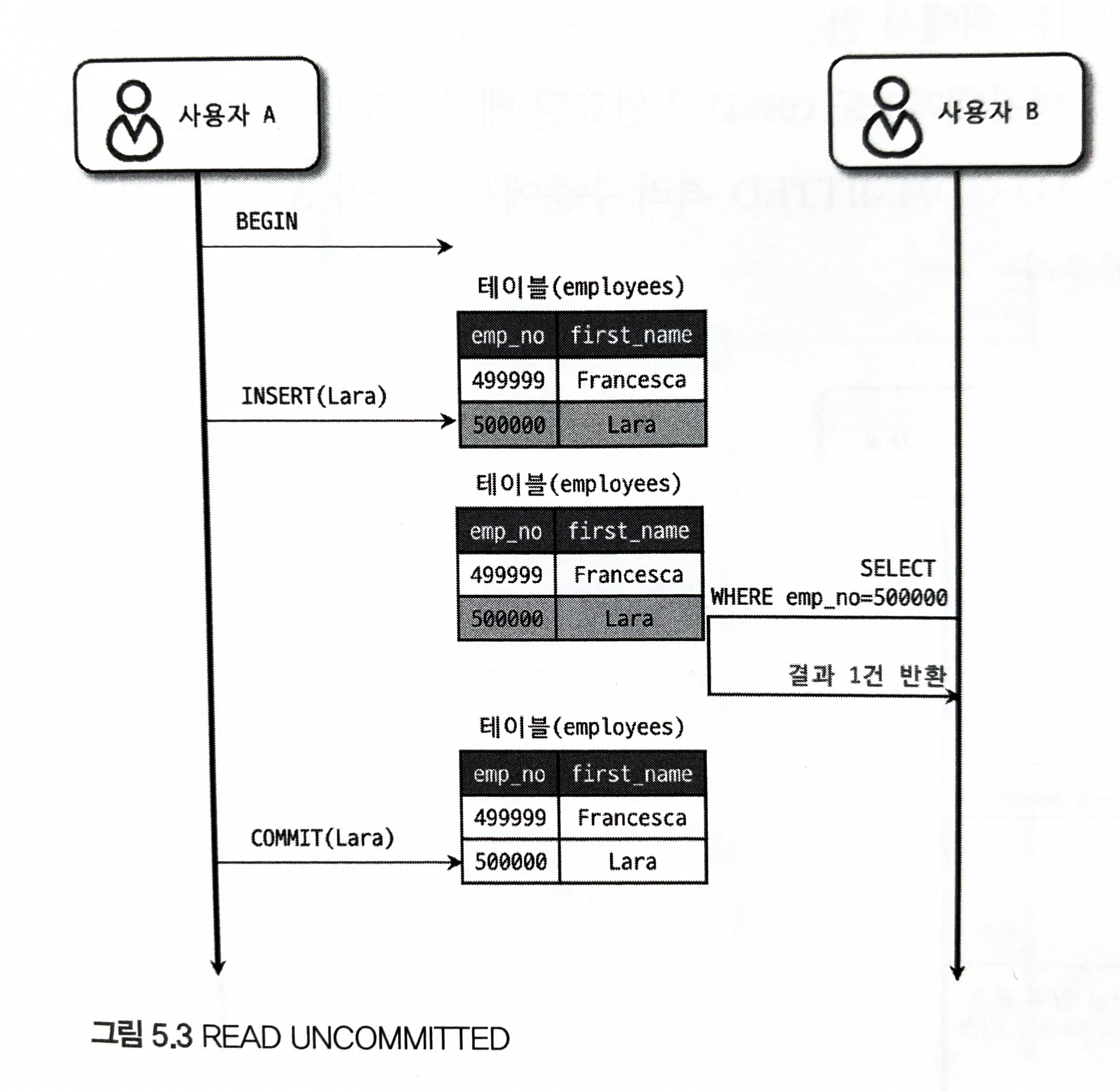 - 각 트랜잭션에서의 변경 내용이 커밋이나 롤백 여부에 상관없이 다른 트랜잭션에서 보인다. 따라서 위 그림에서 사용자 B는 사용자 A가 insert한 데이터를 커밋 전에 볼 수 있다.