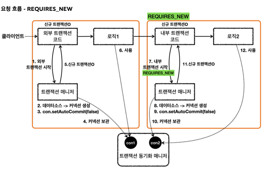 - 트랜잭션 매니저는 트랜잭션을 시작할 때 옵션을 확인한다. REQUIRES_NEW 옵션이면 기존 트랜잭션에 참여하는 것이 아니라 새로운 트랜잭션을 시작하고, 이때 새로운 커넥션을 생성한다.
